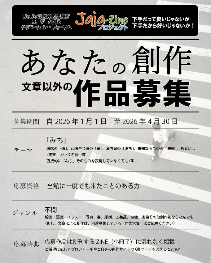 【応募方法】LINE公式アカウント(@jaja-lib)に「『みち』の創作物応募します」と明記のうえ、作品データファイルを添付して送信してください。