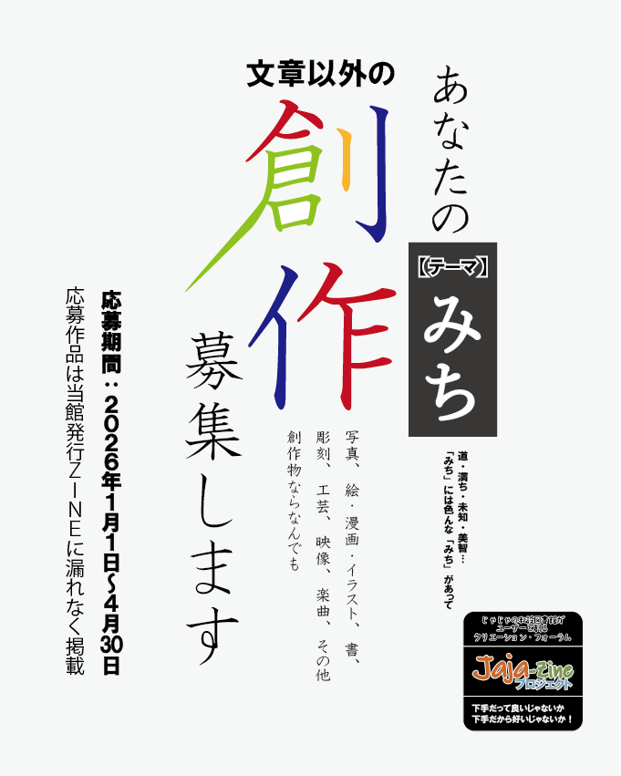 当館では、「みち」をテーマとした作文コンクール「第1回じゃじゃの作文大賞」にあわせて、同じ「みち」をテーマにした創作物も募集します。