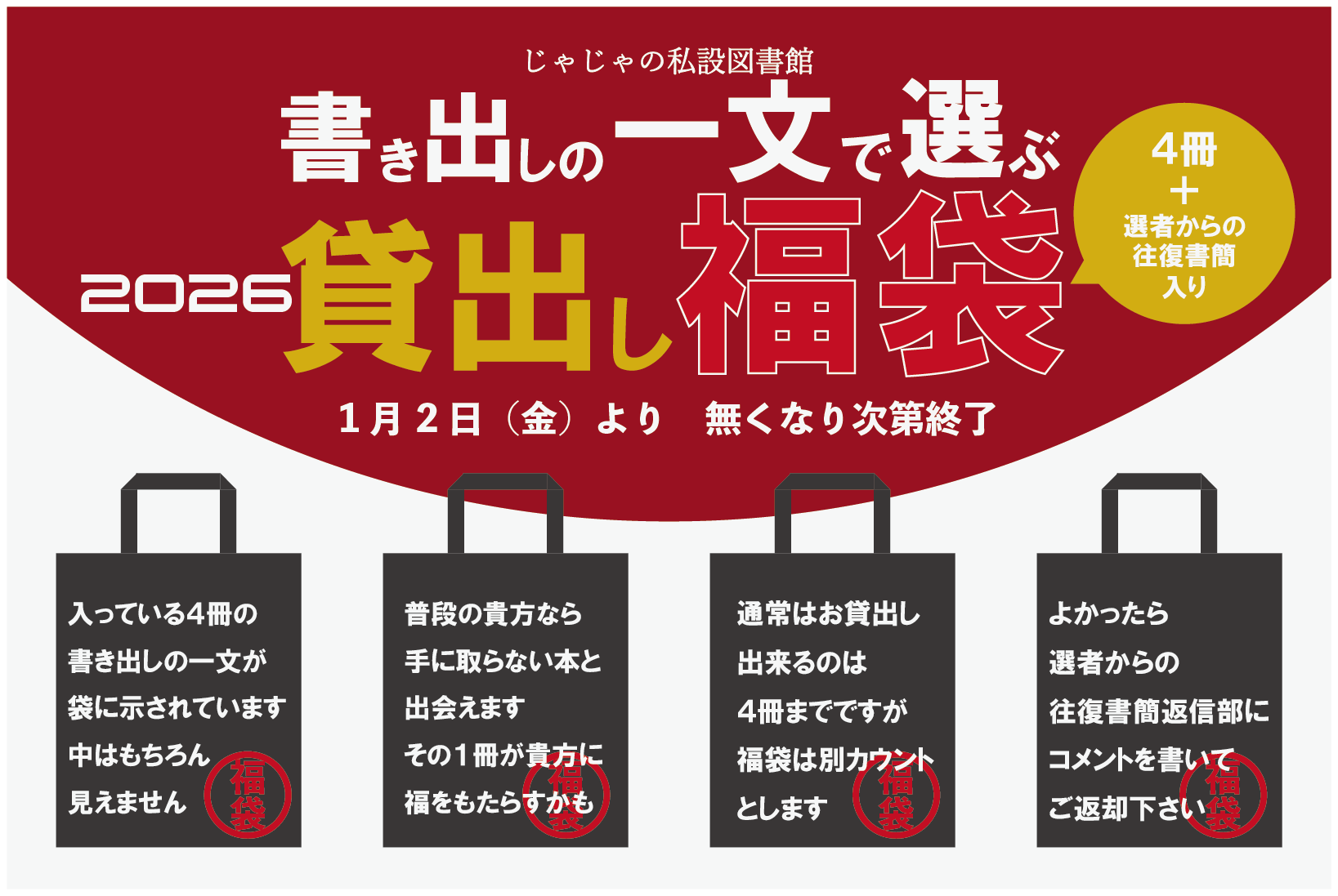 1月2日より恒例の福袋貸し出します 2026 1 2 1月2日より恒例の福袋貸し出します じゃじゃの福袋は、闇雲に選ばせません。中に入っている4冊の書き出しの一文が袋の表に示されています。その一文から、貴方のフィーリングに合う福袋をお選びください。 その本がきっと貴方に福をもたらします。 中には、その4冊を選んだ選者からのメッセージが記された往復書簡が入っています。もしよかったら、書簡返信部にコメントを書いてご返却ください。 通常のお貸出しは4冊までですが、福袋は別カウントなので、既に貸し出し中の方もお貸出し可能です! ← 前の記事 News一覧に戻る 次の記事 →