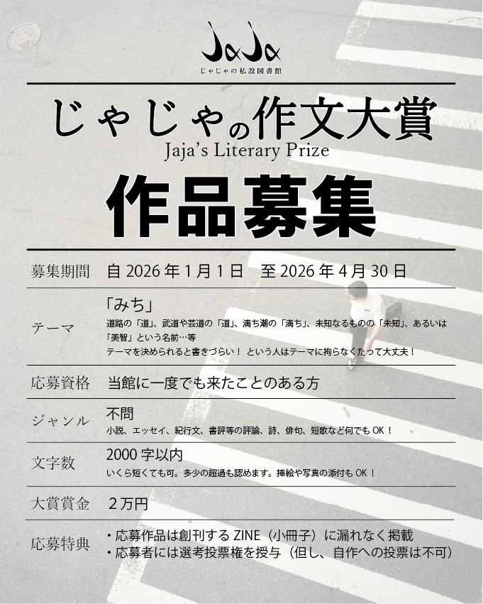 ■応募方法:じゃじゃの私設図書館LINE公式アカウント(@jaja-lib)に「作文大賞に応募します」と記載の上、原稿データを添付して送信してください。手書き原稿は、当館スタッフに直接手渡ししてください。※「作品タイトル」と「ペンネーム」を必ず添えてください。