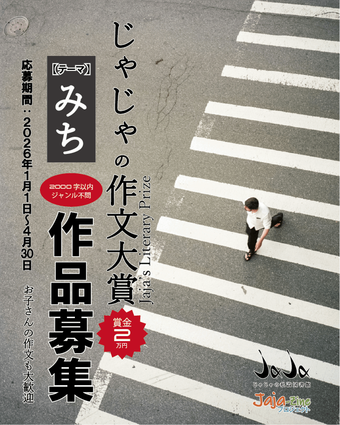 ■応募方法:じゃじゃの私設図書館LINE公式アカウント(@jaja-lib)に「作文大賞に応募します」と記載の上、原稿データを添付して送信してください。手書き原稿は、当館スタッフに直接手渡ししてください。※「作品タイトル」と「ペンネーム」を必ず添えてください。